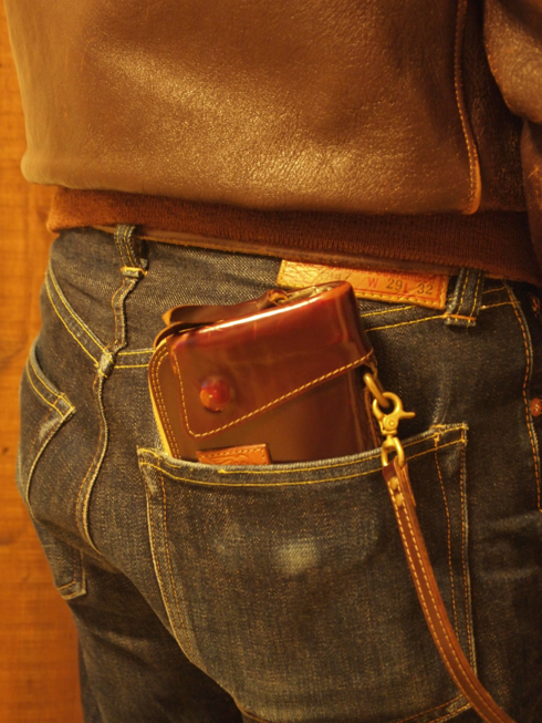A2ジャケットのシンプルなバックスタイルにちょうど良いアクセントを与えるフライトウォレット。ジーンズのポケットにもウォレットのアタリがでるのでそれもまた楽しみである。