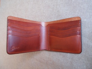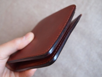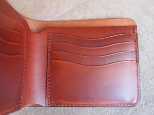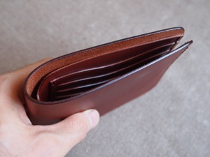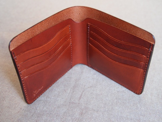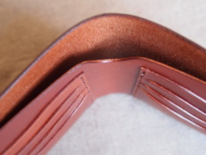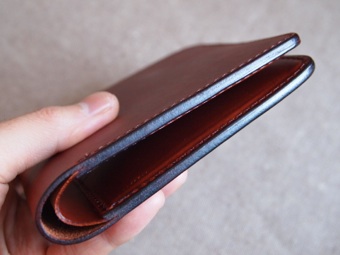 全ての無駄を排した非常にシンプルな札入れである。それ故、革の質感、仕上げにこだわり、もちろん革の床面(裏側)は見えないところまで全て磨き、コバも美しく仕上げている。