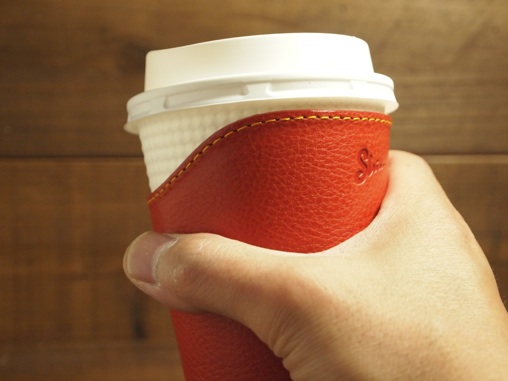 コーヒースリーブを着けることで遮熱/保温の効果があるが、何よりも上質な革の質感がコーヒーの味をより一層引き立てる。