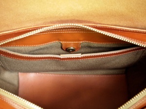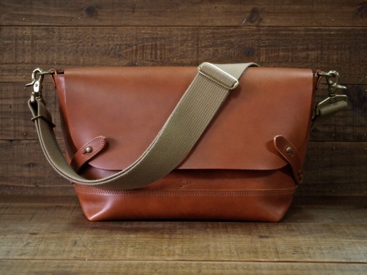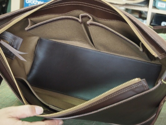 ショルダーストラップと内装が布製の「カジュアル仕様」 写真はダークブラウンのLサイズ。