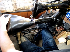 ビンテージSINGER足踏みミシンで一針一針縫い上げる。