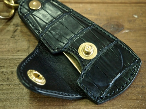 背面にはShinの刻印。 使用しているクロコダイルレザーはテカテカのコーティングがされているものではなく、レザー本来の質感が味わえる半艶仕様。 使えば使う程艶が増し、エイジングも楽しむことができる。