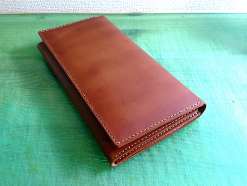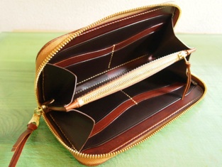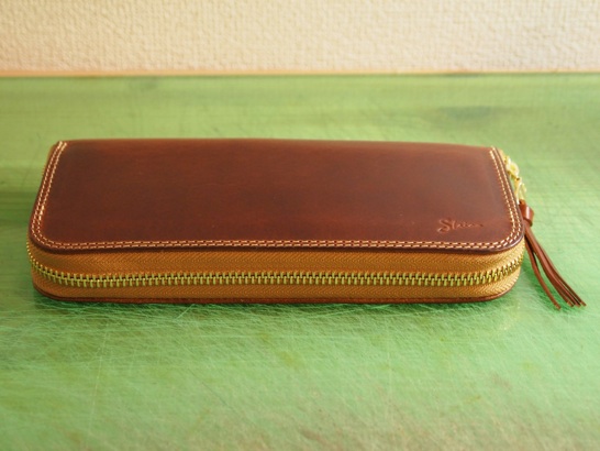 ラウンドファスナーウォレットの赤茶。ステッチを生成りに変更。(通常は赤茶糸)