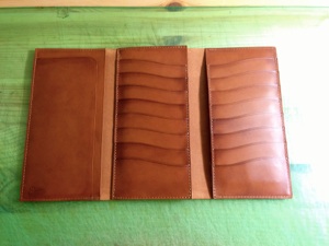3つ折りのカードが沢山入る札入れ。タン色のイタリアンレザーを使用。