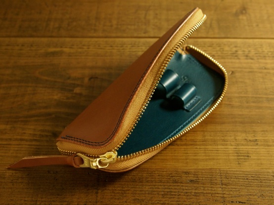 表はタン、内装はブルーのペンケース。ステッチもブルーに。