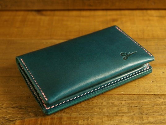 ブルーの名刺入れにピンクステッチ。メインポケットの容量UP。