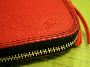 黒&赤というのはとても人気のあるカラーリングですが、赤とファスナーのベージュも非常に雰囲気があります。内装にお客様のお名前をフルネームで刻印しました。
